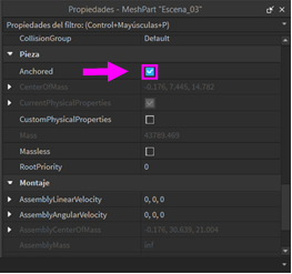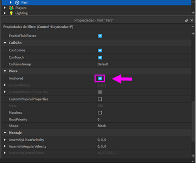 Nota: Al igual que con el modelo anterior, es importante fijar esta pieza en su lugar para que no se desplace. Para ello, debemos activar la opción "Anchored" en la ventana de Propiedades de esta pieza. Esto garantizará que la pieza permanezca en su sitio, sin moverse accidentalmente debido a colisiones u otros factores en el entorno.