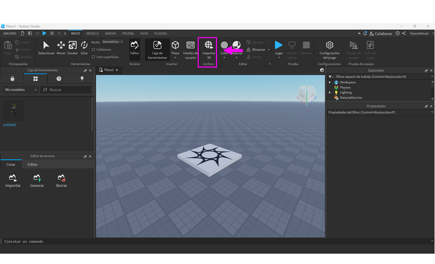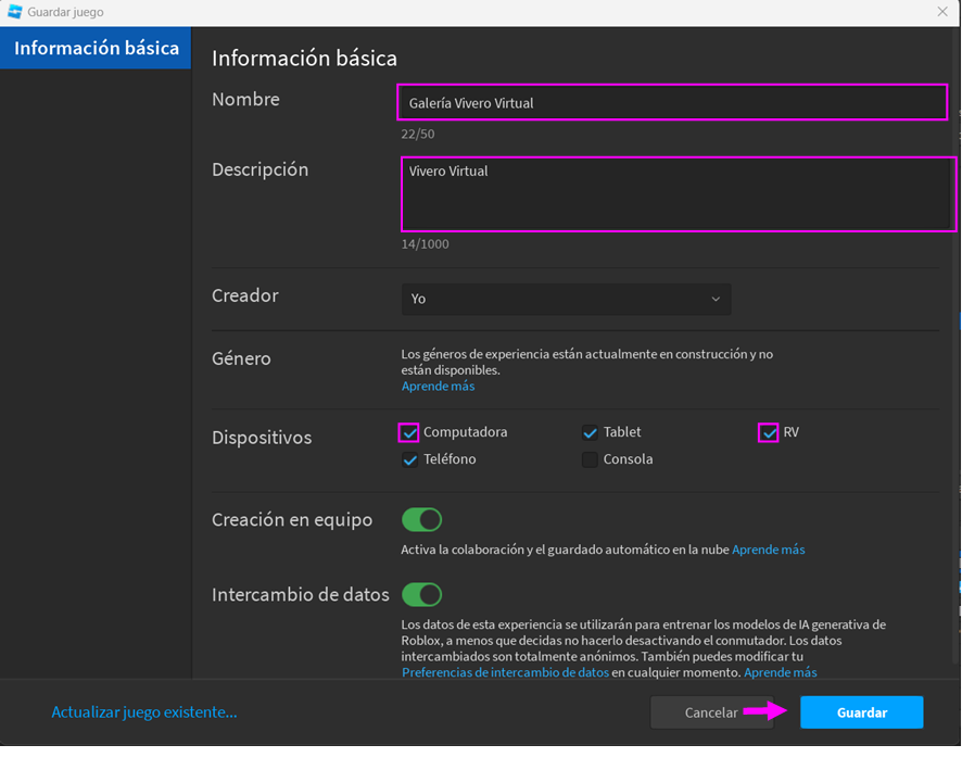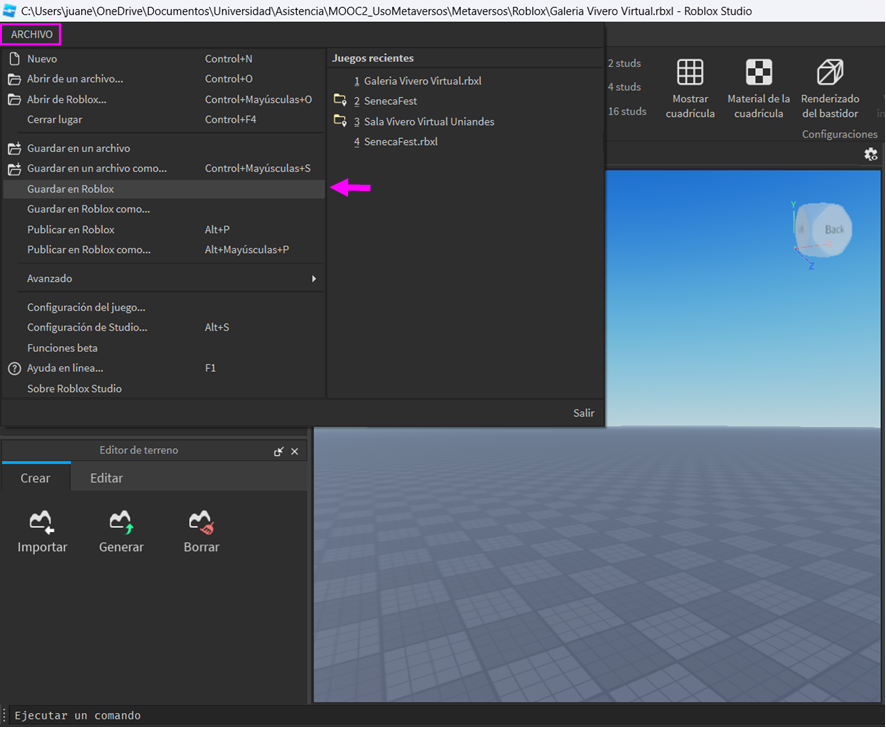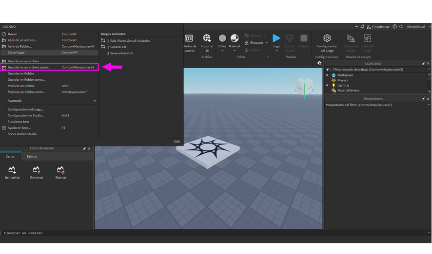En los siguientes pasos, vamos a agregar contenido multimedia personalizado a nuestro entorno. Para hacerlo de manera práctica y directa desde el editor de Roblox, es importante que nuestro proyecto esté conectado con Roblox, lo cual significa que debemos guardar nuestro juego en la plataforma. Esto permitirá que los recursos multimedia, como imágenes y texturas personalizadas, se carguen y almacenen en Roblox, facilitando su integración en el escenario.