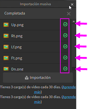 Nota: En este caso la carga se demorará un poco más que cuando solo agregamos una imágen a nuestro proyecto. Debemos esperar a que todas las imágenes se hayan cargado en el proyecto. Esto lo sabremos porque todas tendrán este símbolo de confirmación al lado: