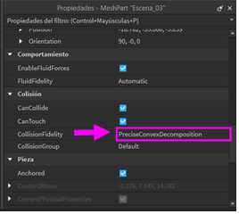 Para ajustar la malla de colisión, dirígete nuevamente a la ventana de Propiedades y busca la sección llamada "Collision". En esta sección, verás una opción llamada "CollisionFidelity", la cual estará configurada en Default de forma predeterminada. Cambia este valor a PreciseConvexDecomposition, que permitirá que la malla de colisión se ajuste con mayor precisión a la forma del modelo, siguiendo sus contornos de manera detallada. Esta configuración asegura que las colisiones del modelo sean más realistas y exactas, lo cual es especialmente útil en entornos interactivos donde se requiere una precisión elevada en la detección de colisiones.