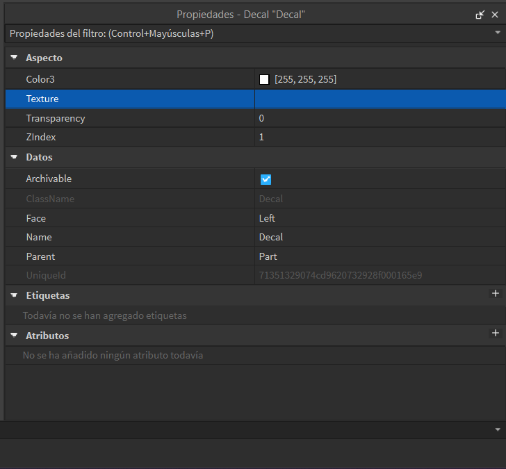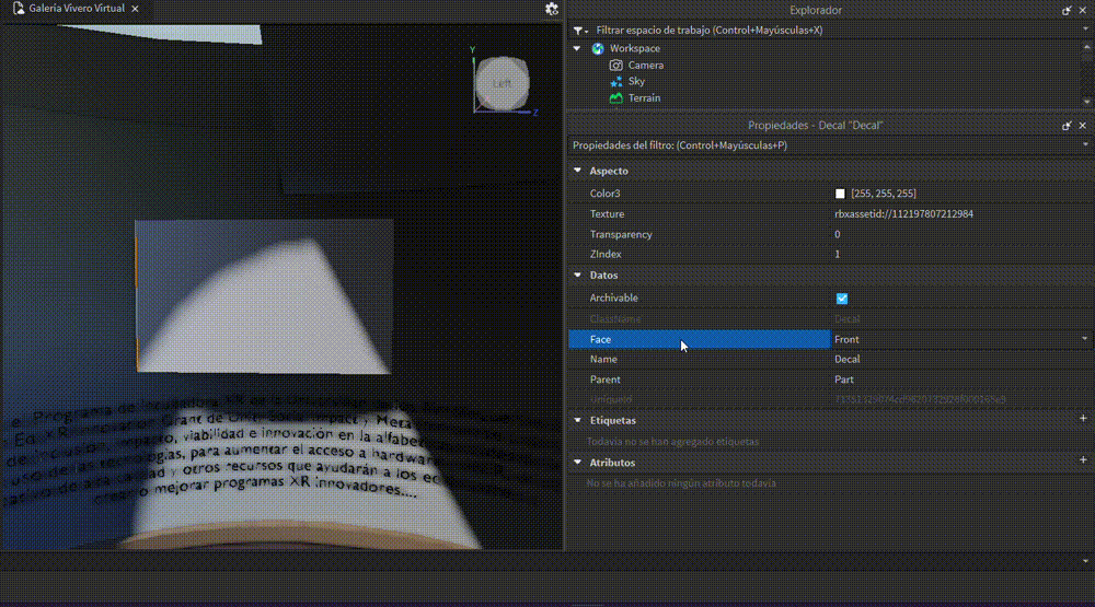 Nota: En algunos casos, puede que la imagen no sea visible de inmediato. Esto puede suceder si la imagen se está mostrando en una de las caras laterales o traseras de la pieza. Para corregir esto, dirígete al apartado "Face" en la ventana de Propiedades del componente "Decal" y selecciona diferentes opciones hasta que la imagen aparezca en la cara frontal de la pieza. Esto asegurará que la imagen sea visible desde el ángulo deseado en el escenario.