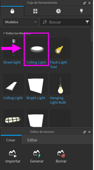 Se nos abrirán múltiples opciones de luces. En este caso vamos a escoger Celling Light la cual es una lámpara que podremos acomodar en el techo del modelo. Para importarla simplemente daremos click sobre ella y el objeto 3D se creará en la escena.