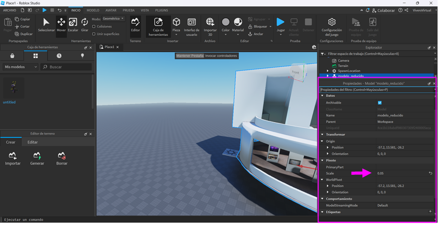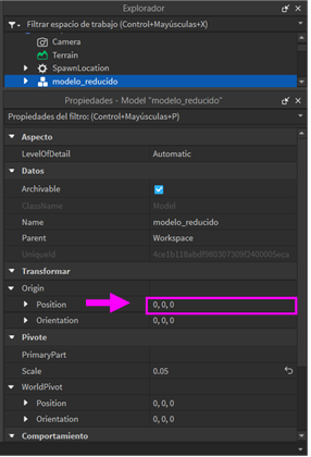 Para hacer esto, dirígete a la ventana de Propiedades del Modelo y busca la casilla llamada "Position". En esta sección, encontrarás los valores de posición en los ejes X, Y y Z. Cambia los valores actuales a 0, 0, 0, lo que colocará el modelo en la posición central de la escena (coordenadas 0 en X, 0 en Y y 0 en Z). Esto asegura que el modelo esté alineado con el suelo y posicionado adecuadamente para que sea visible y accesible desde el punto de aparición inicial.