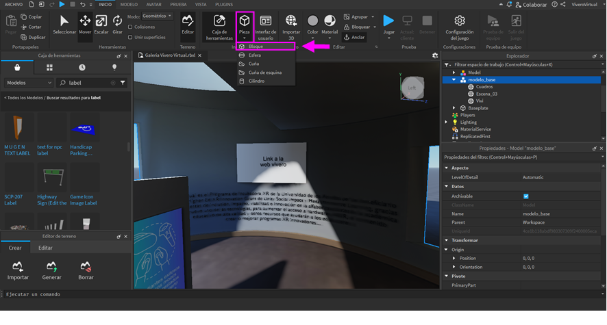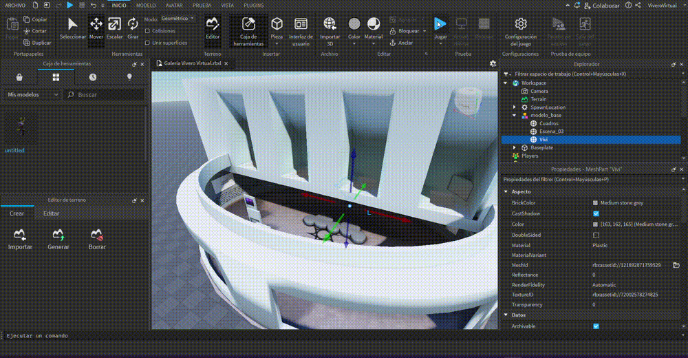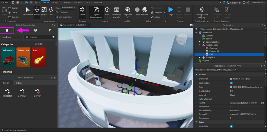 La temática de nuestro metaverso será una galería inspirada en el Vivero Virtual. Para construir esta galería, primero estableceremos una estructura principal que servirá como base para organizar y presentar el contenido. Esta estructura inicial será un modelo 3D que funcionará como el marco de la galería, brindando el espacio adecuado para exhibir los diferentes elementos. A partir de esta base, podremos agregar otros modelos 3D que aporten detalles específicos, incorporar imágenes y texturas relevantes, y realizar modificaciones que personalizan el espacio de acuerdo a la temática.