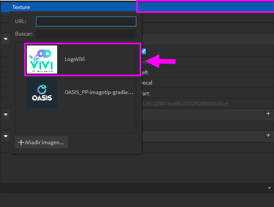 Haz clic en esta opción ( En el cuadro de la derecha) para desplegar las imágenes disponibles, y selecciona la que cargaste anteriormente. Esto aplicará la imagen como una textura en la superficie de la pieza, personalizando aún más el escenario.