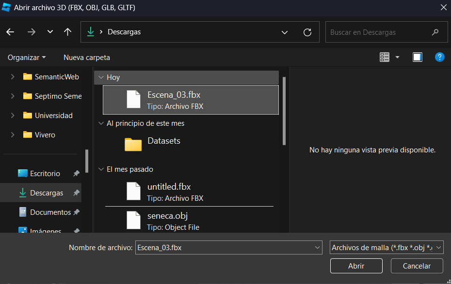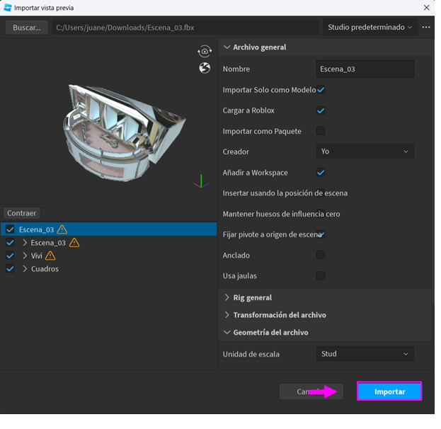 Para finalizar el proceso y confirmar la importación, haremos clic en el botón "Importar", lo que añadirá el modelo a nuestro proyecto, listo para ser posicionado y ajustado dentro de la galería.