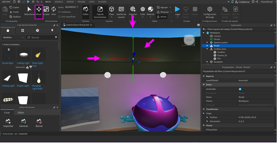 Perfecto. Ya hemos aprendido cómo agregar modelos 3D a nuestro ambiente. Además, sabemos cómo ajustar tamaños y ajustar la locación de estos. Por otra parte, hemos podido agregar luces a nuestra escena para que se vea más iluminada.