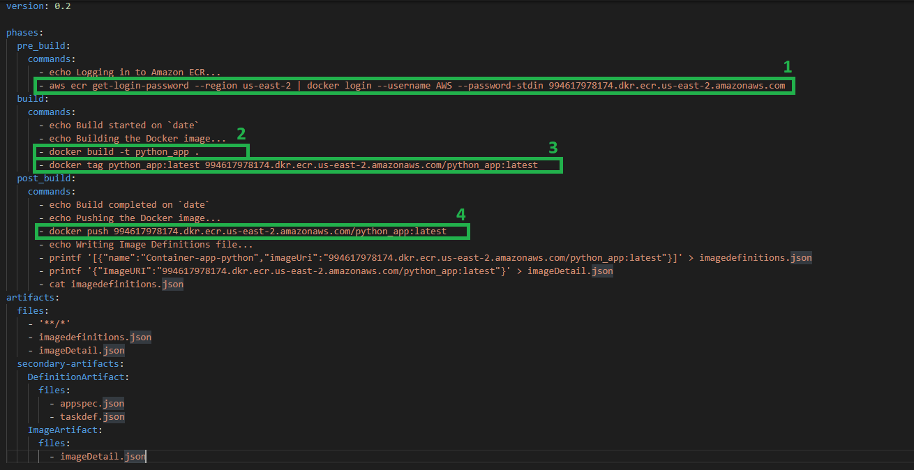 Adicional, deberá construir y definir los artefactos imagedefinition.json, imageDetails.json, appspec.json y taskdef.json