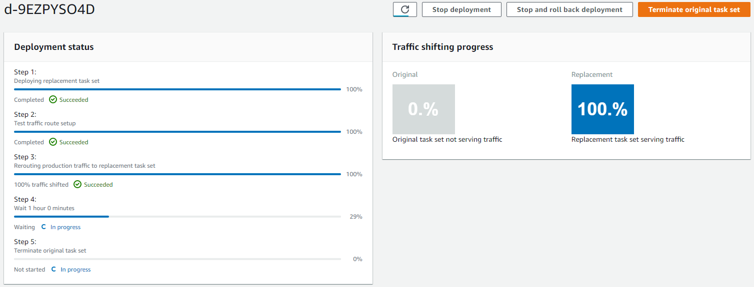 El Pipeline iniciará nuevamente y en CodeDeploy podrá observar la distribución de tráfico.