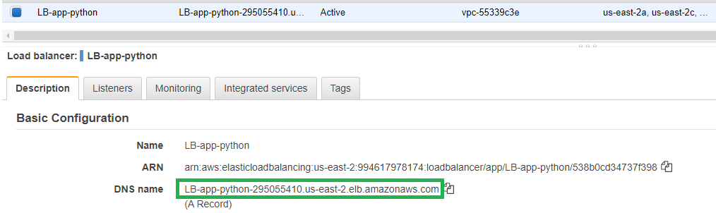 Al finalizar la configuración del servicio observará que hay 2 tareas en ejecución que corresponden a 2 contenedores corriendo la aplicación. Puede acceder a la aplicación a través del DNS name de su balanceador de carga.