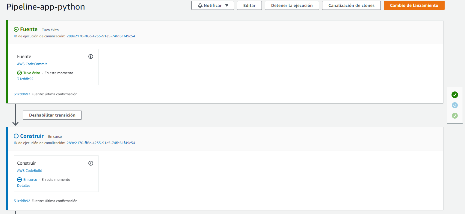 Después de finalizada la configuración del Pipeline observara una ventana como la siguiente en la cual se observa el proceso que lleva el flujo de trabajo iniciando por la identificación de los cambios en el repositorio de CodeCommit, a continuación, se realiza la compilación del proyecto en CodeBuild y por último se procede con el despliegue de la aplicación a través del servicio Amazon ECS (Blue/Green).