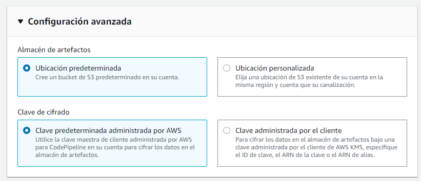 En la sección "Configuración avanzada" podrá modificar algunas características del almacenamiento de los artefactos. Si ya cuenta con un bucket de S3 puede elegirlo para almacenar los artefactos allí, por otro lado, puede seleccionar si la clave de cifrado es administrada por usted o por AWS. En este caso los valores se dejarán por defecto.